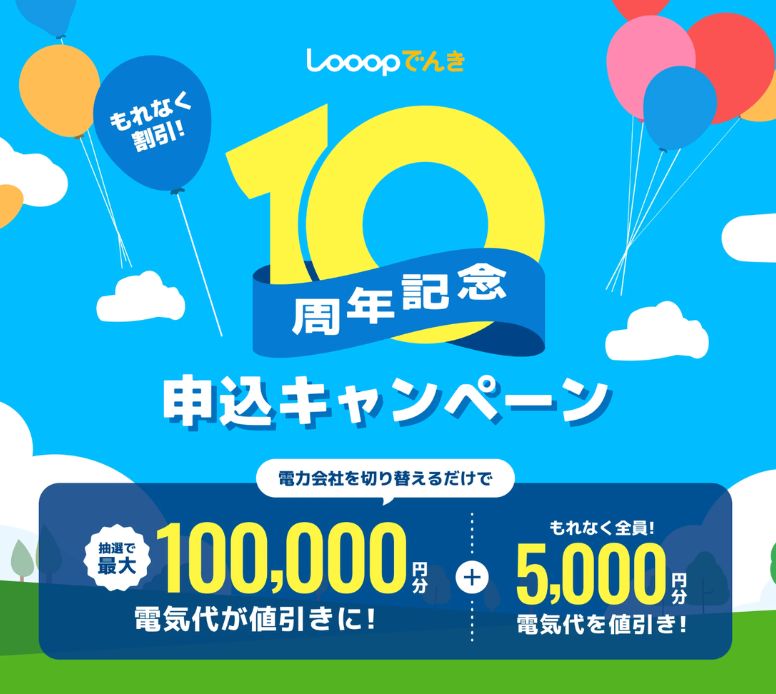 さらに、2026年3月31日までは「Looopでんき10周年 申し込みキャンペーン」を実施しています。期間中にLooopでんきの「スマートタイムONE(電灯)」を契約した方は、以下の特典を受けられます。