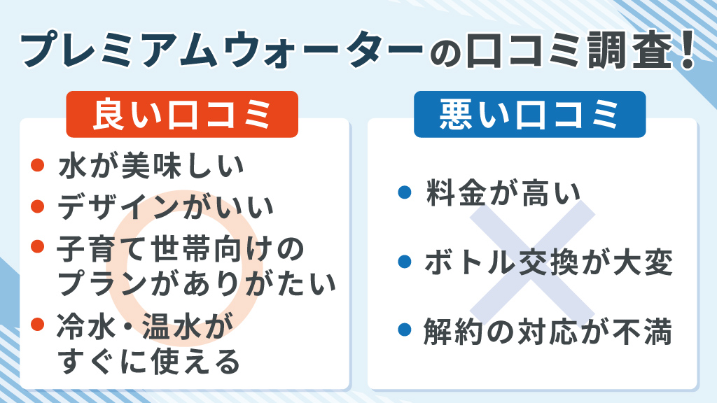 実際の利用者からは「水がおいしい」「デザインがおしゃれ」「子育てに便利」といった良い口コミが多く見られる一方で、「料金が高い」「解約の手続きが雑」といった不満の声もありました。